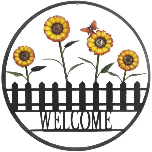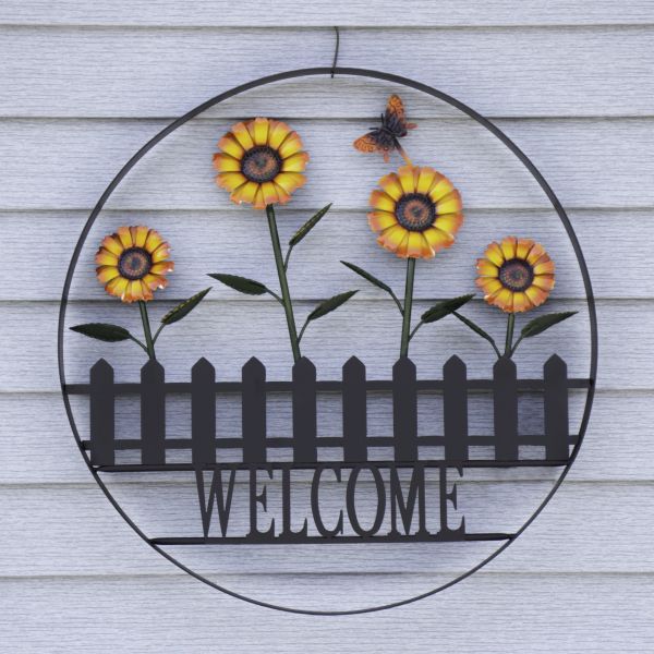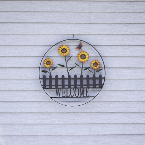 The 23.5-inch diameter is designed to fit comfortably into an entryway, yet it is large enough to be visible from the road as passerbys drive past. The powder-coated finish and wrought iron construction are weather-resistant, so this Welcome Wheel will be inviting guests to your home for a long time!