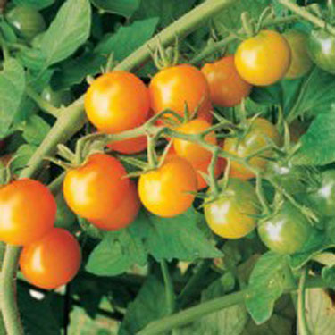 Sungold Cherry Tomato, Solanum lycopersicum ‘Sungold’, is a golden cherry tomato that is very productive offering its fruits very early in the season. ‘Sungold’ fruits are light orange colored, thin-skinned and very sweet. Not quite gold and not quite red but when orange, the flavour is outstanding! Rich and fruity tomatoes in long trusses on vigorous indeterminate vines keep on producing all summer. A must for garden snacks with a taste that can’t be beat.