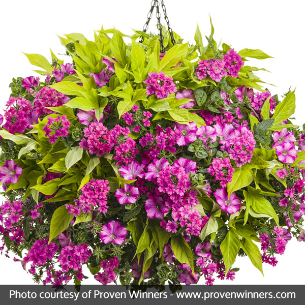 The ‘Supertunias® Raspberry Blast’ is a vigorously trailing species of an ever-blooming, long-living petunia from Australia. They will provide long-term color in full sun areas throughout the season, and can grow nearly an inch a day!