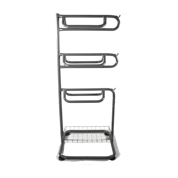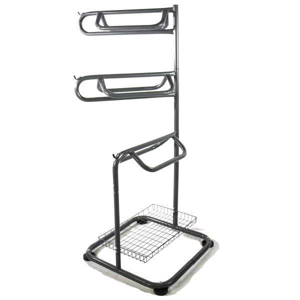 Securely holds three saddles! Black enamel-coated tubular steel with a box base for extra stability. Special swivel design allows for adjustments to meet any storage or display needs.