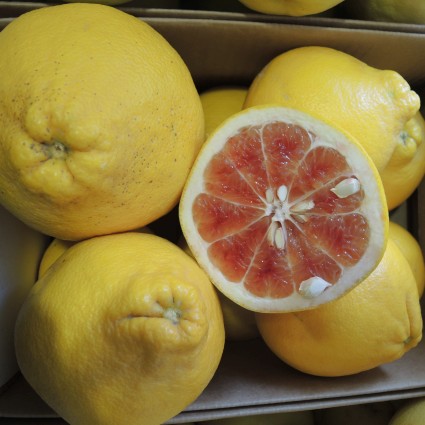 Valentine Pummelo (Citrus maxima hybrid) – sometimes spelled Valentine Pomelo) is a relatively new fruit on the market and we are very proud to offer it to you. The fruit are heavy for their size and ripen around February 14 every year. A cross between a pummelo and a blood orange gives the flesh its deep red color and sweet-tart taste. If you are lucky enough to live where citrus trees flourish, you’ll want to give Valentine a try. We don’t guarantee it will spice up your love life – but we don’t guarantee it won’t either!