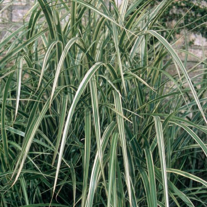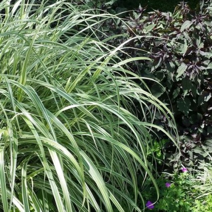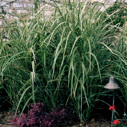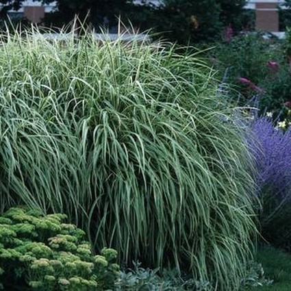 The Grass ‘Variegated Japanese Silver’, Miscanthus sinensis ‘Variegatus’, is a creamy white variegated grass. The feathery seed heads contribute to the striking appearance of this grass, making it an excellent alternative to Pampas Grass. Shearing after first frost for overwintering is recommended.