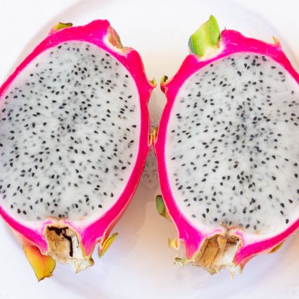 Dragon fruit, also called, “pitahaya” or “strawberry pear” is extremely dramatic in appearance yet mildly sweet in flavor. This variety produces fruit about the size of a kiwi with a fiery magenta peel when fully ripe that has greenish yellow ‘dragon scales.’ When you slice into a White Dragon Fruit, you’ll find white flesh speckled with tiny black seeds. This fruit often has a crisp texture and sublime juice.
