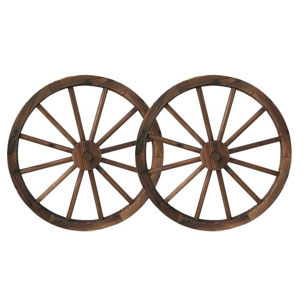 The 23 inch burnt stain colored wagon wheels are the best way to add a tasteful rustic feel to your outdoor or indoor decor. They look great mounted on a wall or sitting on the ground leaning up against basically anything! This set comes with two identical Burnt Stain Colored Wagon Wheels.